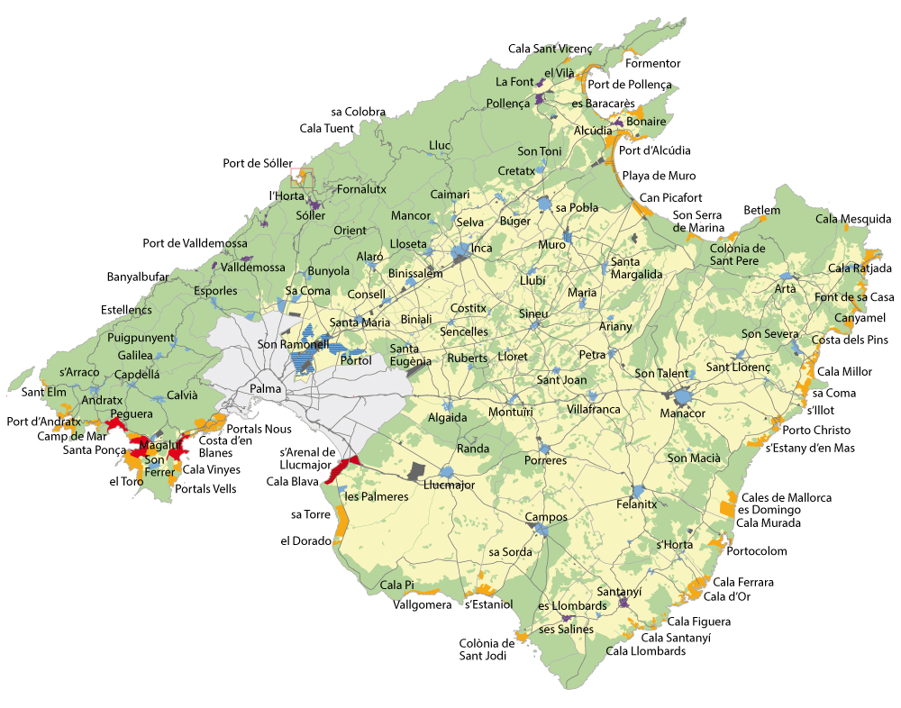 Der PIAT genannte Zonenplan ist der zentrale Punkt des Tourismusrahmengesetzes: genau aufgeschlüsselt wird zwischen Gegenden unterschieden, die touristisch ausgelastet sind und solchen, die noch ein paar Gäste vertragen können, hier darf das ganze Jahr über an Urlauber vermietet werden. Es gibt einige Gegenden, in denen die Vermietung komplett verboten ist, zum Beispiel an der Playa de Palma oder genauer gesagt von Es Carnatge (Can Pastilla) bis zur Ortsgrenze nach Llucmajor in Arenal. Das gleiche gilt für landschaftliche Schutzgebiete und Industrie- und Wirtschaftsgebiete.