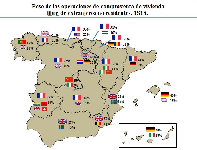 Stärkste Käufergruppe unter den Nicht-Spaniern sind landesweit die Briten. In den Provinzen Murcia, La Rioja, Andalusien und in der Region Valencia belegen sie Platz 1 unter den ausländischen Käufern. Entlang der französischen Grenze und am Golf von Biscaya kaufen vor allem die Franzosen gerne in Spanien. Auf den Balearen, insbesondere Mallorca, dominieren hingegen die deutschen Käufer mit einem Anteil von 46% den Markt.