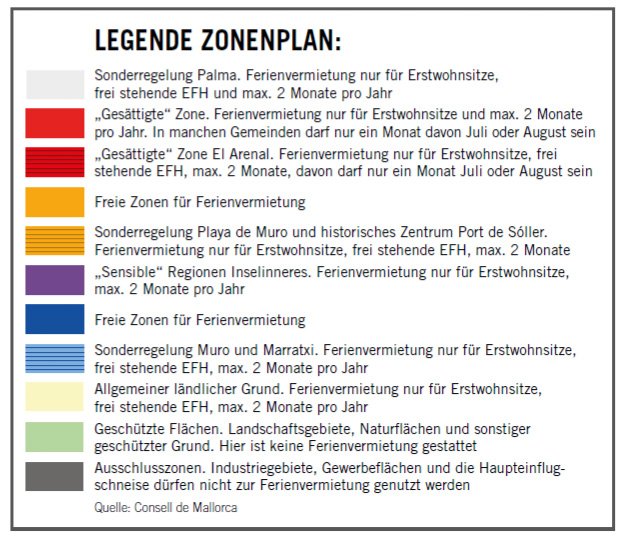 Dann gibt es noch verschiedene Orte, die als „empfindlich“ gelten: darunter fallen rund 31 Gebiete, zum Beispiel bestimmte Abschnitte von Deià, Pollença, Sóller, Ses Salines, auch auf allgemein ländlichem Grund, wo ebenfalls nur eingeschränkt vermietet werden darf. An empfindlichen wie auch an „gesättigten“ Orten gilt eine 60-Tage-Regelung, das heißt, diese Objekte dürfen maximal zwei Monate im Jahr ferienvermietet werden. Das sind zum Beispiel auch die Palma-nahen Küstenstriche wie südwestlich Palmanova, Magaluf, Santa Ponça und Peguera bzw. südöstlich Arenal, Cala Blava oder Son Verí Nou.